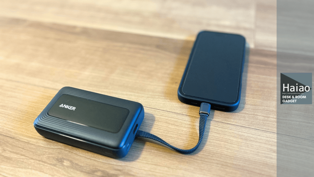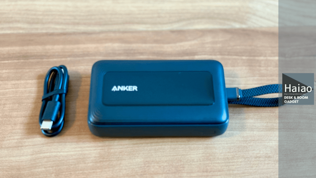 そして、一番の特徴である一体型のUSB-Cケーブルは、本体側面にスマートに収納されています。必要な時にサッと引き出せるだけでなく、使わない時は邪魔にならないように設計されているのは、さすがAnker!ケーブルの付け根部分もしっかりと補強されており、耐久性への配慮も感じられます。