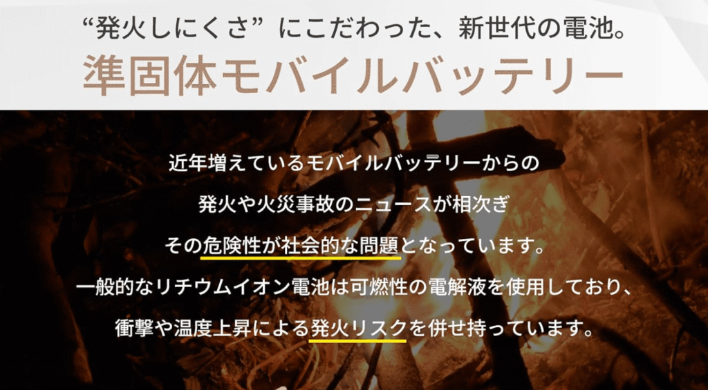 この製品の最大の特徴は、一般のリチウムイオンバッテリーとは異なる「準固体」という電解質技術を採用している点にあります。発火リスクの低減や、極端な温度環境下での動作安定性など、従来のモバイルバッテリーにはない魅力が詰まっていました。