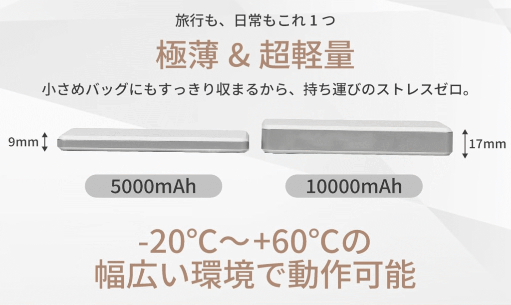 また、10000mAhクラスの製品と比較すると、厚みや重量が約半分に抑えられるため、携帯性を重視するユーザーにとっては絶妙なバランスと言えます。航空機への持ち込み制限(一般的に100Wh未満、本製品は19.25Wh)もクリアしており、出張や旅行にも最適です。
