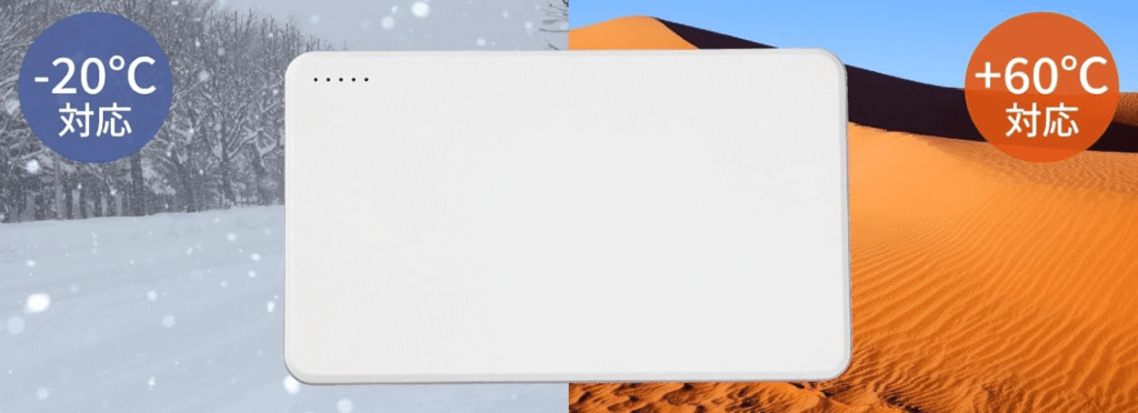 本製品の60℃という動作温度上限は、一般的なモバイルバッテリー(多くは40℃~45℃)と比較して非常に高い水準です。準固体電解質は熱安定性に優れ、高温下でも電解質の分解やガス発生が抑制されるため、従来型と比較して安全性が格段に向上しています。