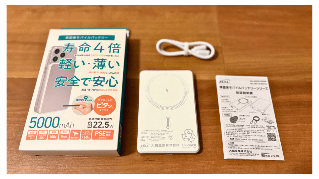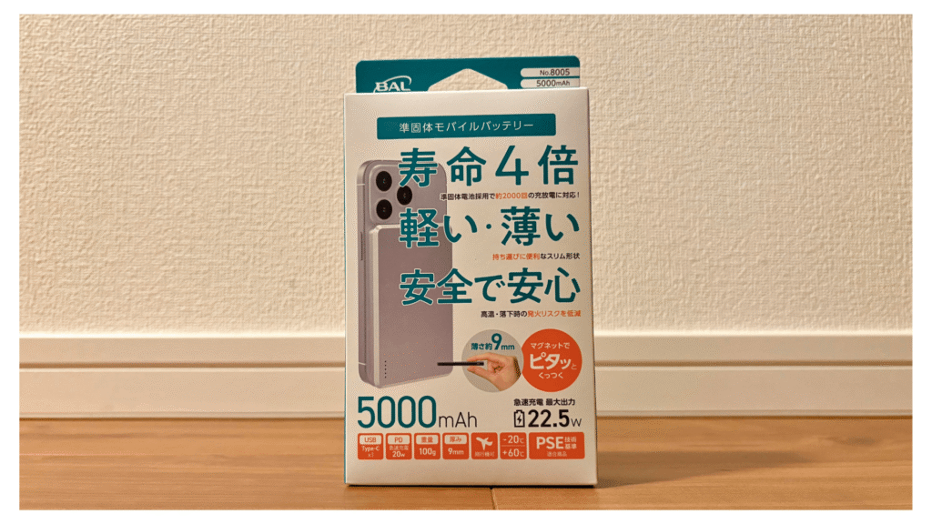 そんな中、私が注目し今回実際に手に取って検証したのは、自動車用品という安全性が求められる分野で長年培ったノウハウを、民生品にも活かしているBAL(大橋産業)から発売された「準固体モバイルバッテリー 5000mAh」。