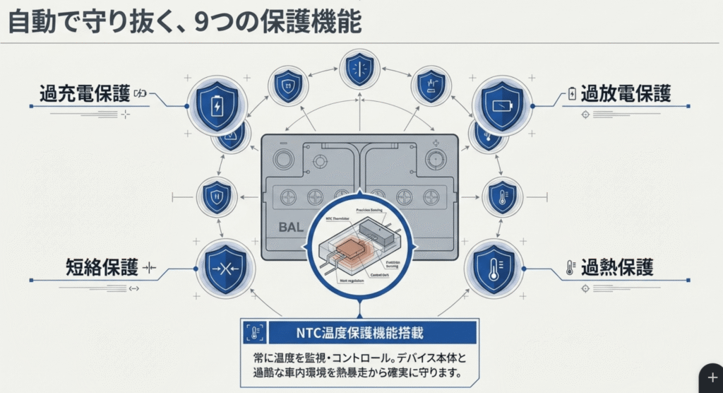 本製品の保護機能は、単なる「おまけ」ではなく、安全性を根幹から支える重要な要素です。実際に搭載されている保護機能を列挙し、それぞれの役割を解説します。