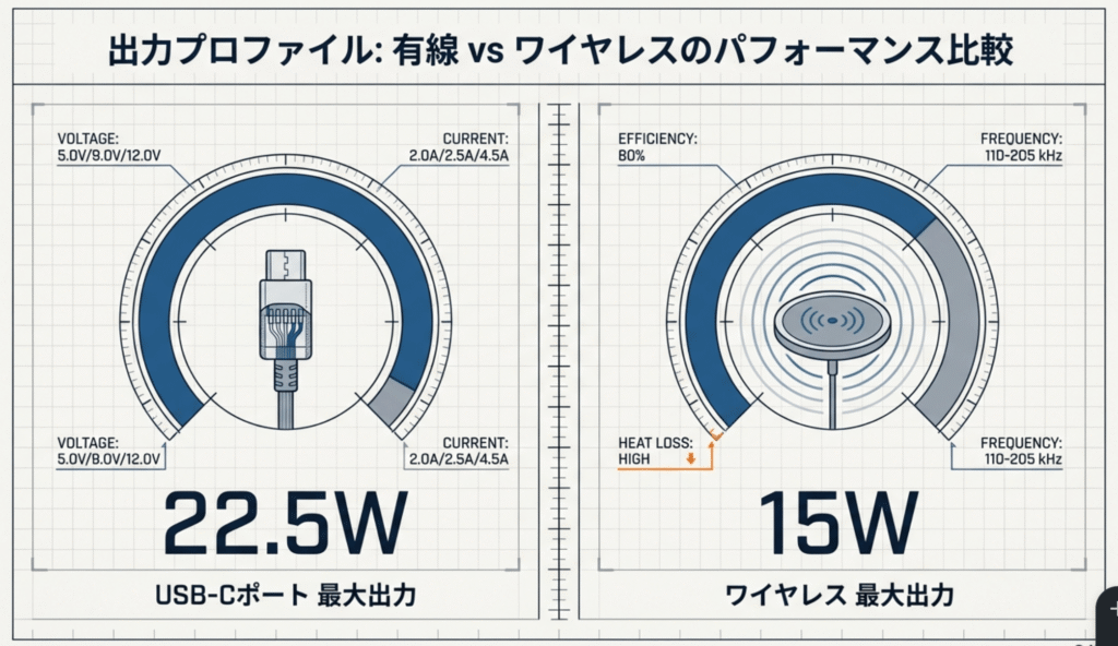 実際の充電性能を検証してみましょう。本製品のスペック上、USB-Cポートからの最大出力は22.5W、ワイヤレス出力は最大15Wに対応しています。