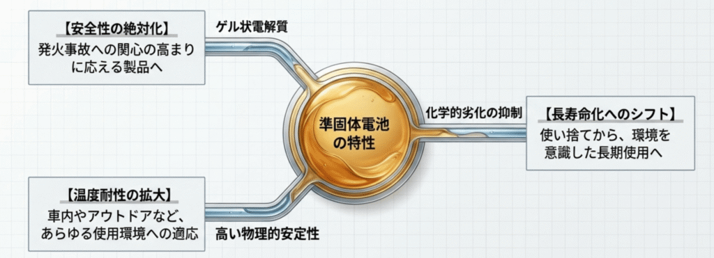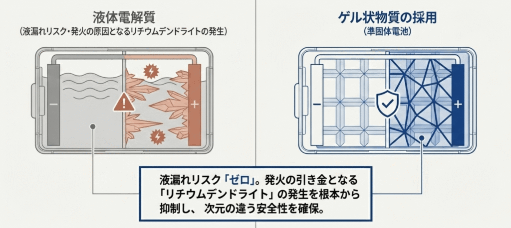 また、液漏れのリスクが極めて低いことも大きな特徴です。液体電解質を使用しないため、仮に外装に傷が入っても内部の物質が漏れ出す心配がありません。さらに、燃えにくいという特性も備えており、万が一の事故時にも二次災害を防ぐ設計となっています。