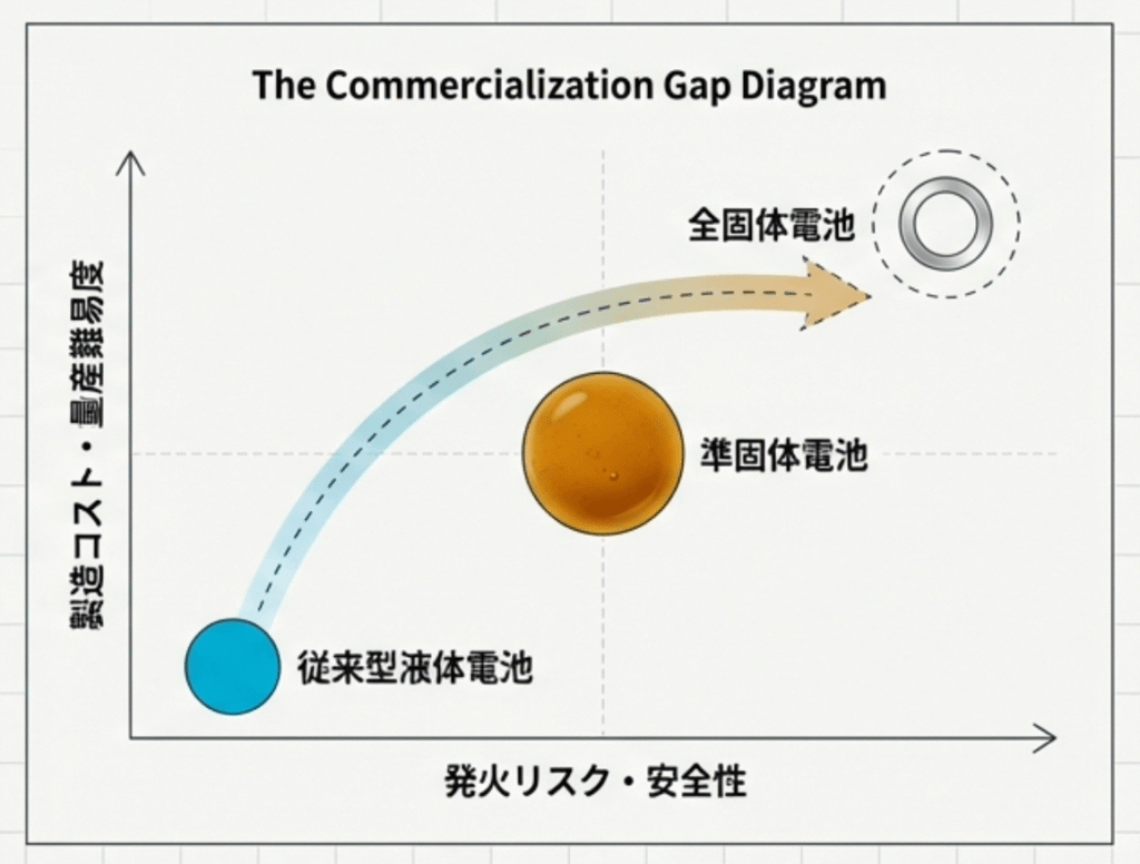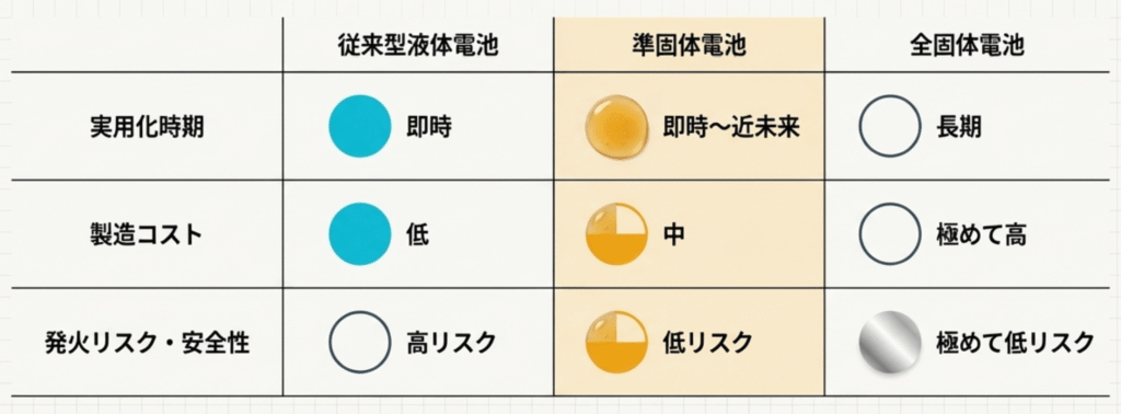 全固体電池ほどの製造コストがかかるわけではないとみられるとともに、発火リスクなどの安全性課題を一定程度改善できる可能性があることから、実用化段階の一つとして注目が集まっています。