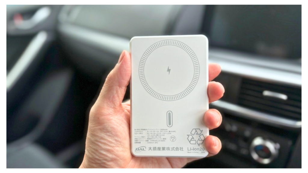 次に、実際に車内での使用シーンを想定したテストを行いました。私の愛車はMAZDA CX-5で、日常的にカーナビや音楽再生のためにiPhone16を使用しています。車内でのモバイルバッテリー使用において重要なのは、「走行中の振動で外れないか」「高温になる車内で安全に使用できるか」の2点です。