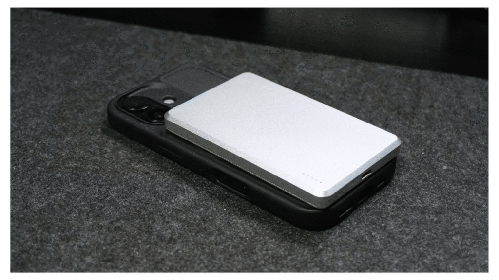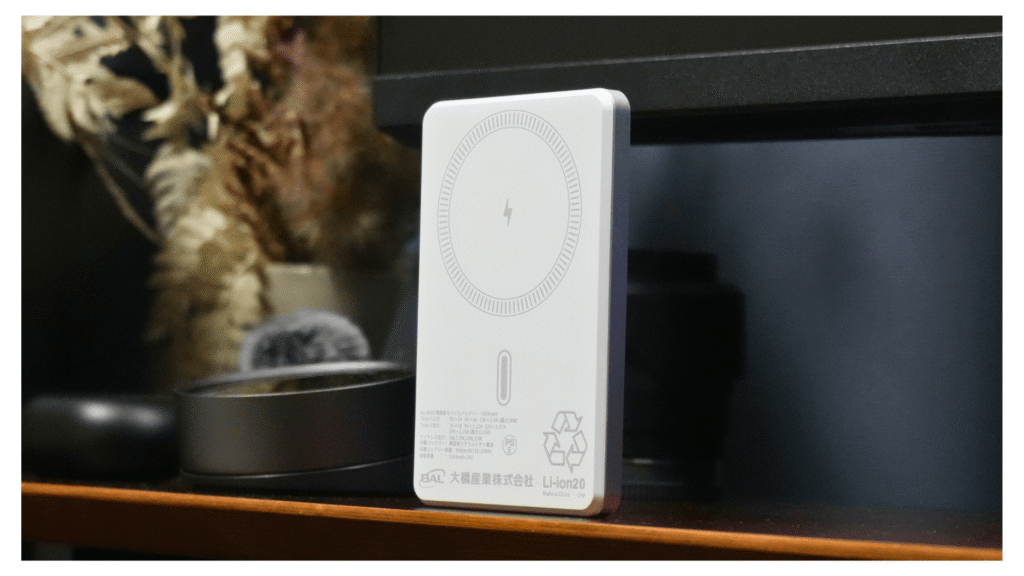特筆すべきは、装着時の「かさばり感のなさ」です。多くのMagSafe対応モバイルバッテリーは厚みがあり、装着するとスマートフォンの操作感が大きく損なわれます。しかし本製品は9.5mmという薄さのおかげで、片手操作時にもほとんど違和感がありません。ポケットに入れた状態でも、ブカブカした感じがなく、ストレスフリーで持ち運べます。