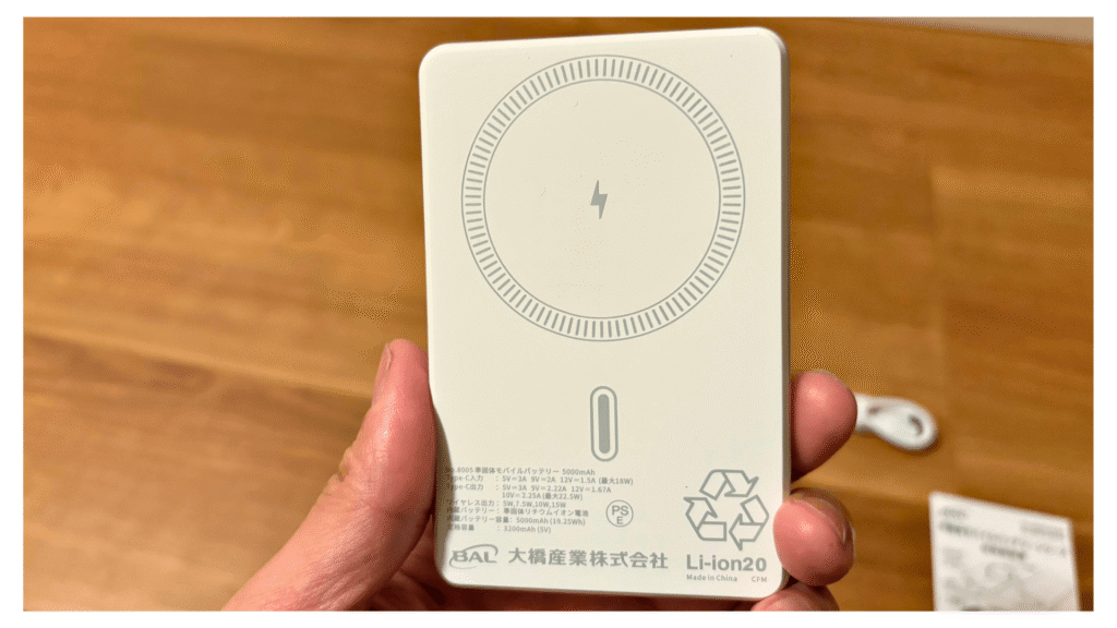 また、本製品の定格出力容量は3,200mAh(5V時)です。これは内蔵バッテリー容量5,000mAhに対して、約64%の変換効率を示しています。ワイヤレス充電の変換ロスや、昇圧回路での損失を考慮すると、十分に標準的な数値と言えるでしょう。