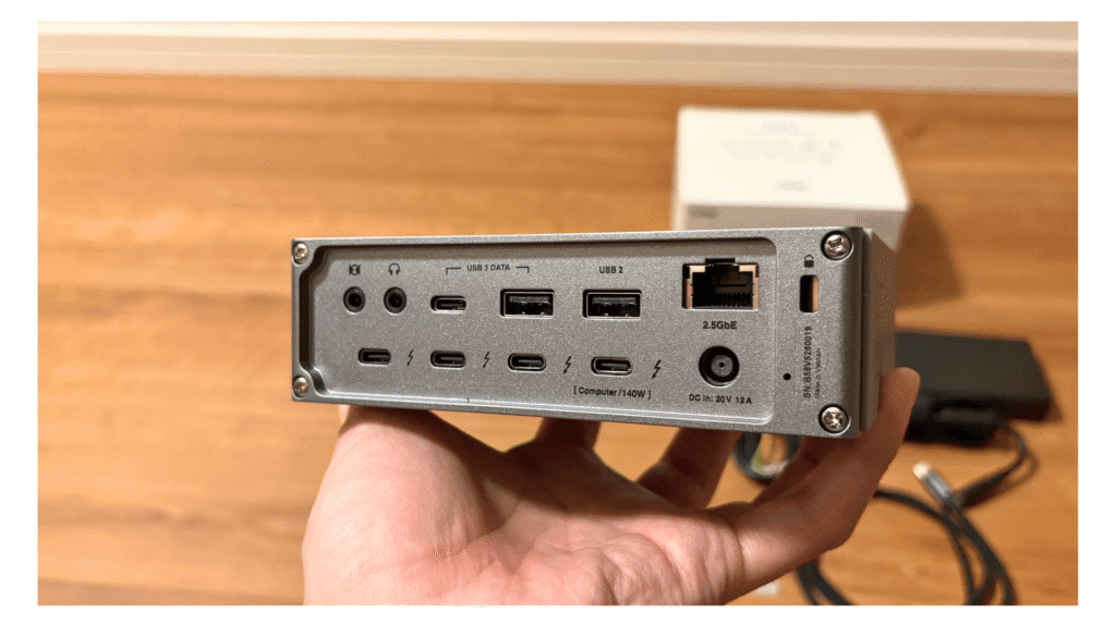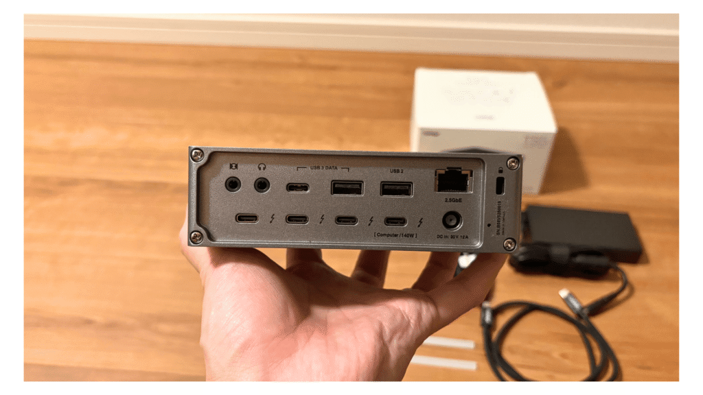むしろ重要なのは、ドック自体が持つ「ポートの豊富さ」と「給電能力」です。TS5はThunderbolt 5ホストポートから最大140Wの給電が可能で、これは将来的に16インチMacBook Proを購入した場合でも、純正アダプターと同等の高速充電を実現します。「将来、MacBook Proに買い替えても、このドックだけは引き続き使える」 という安心感が、私がこの製品を選んだ最大の理由です。