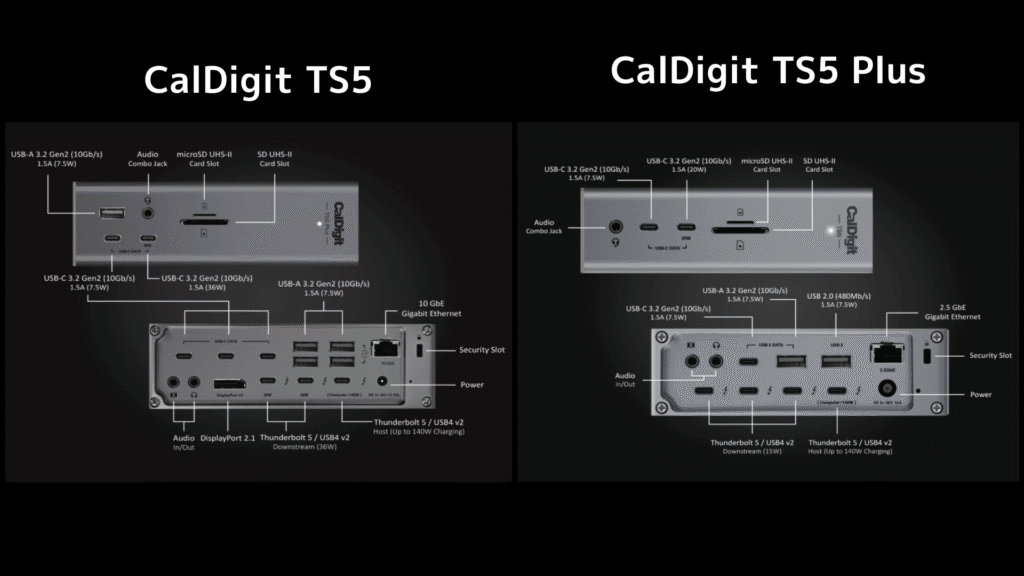 - TS5:幅広いユーザーを想定したバランスモデル。USB-C接続のパソコン(USB-CポートのみでThunderbolt非対応の機種)でも、基本機能(給電・USB接続・映像出力など)が使えるよう設計されています。