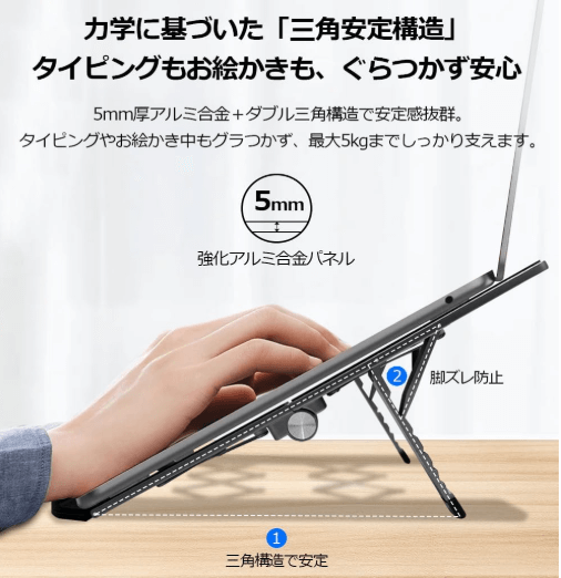 はい、問題なくお使いいただけます。製品の最大耐荷重は5kgとして設計されています。一般的な15.6インチのゲーミングノートPCの重量は約2kg〜2.5kg前後であることが多いため、5kgという耐荷重には十分な余裕があります。また、厚さ5mmのアルミ合金とダブル三角構造により、重いPCを載せた時の「たわみ」や「グラつき」にも強く、安定した使用感をお約束します。