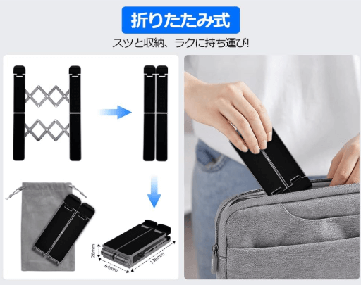 - 整理面:コンパクトに折りたたんだスタンドを収納袋に入れることで、バッグ内でかさばらず、すっきりと整理できます。また、袋から出す際もパッと取り出しやすく、無くしにくいという利点もあります。出張やカフェ作業など、外出先で使用される方には特におすすめの付属品です。