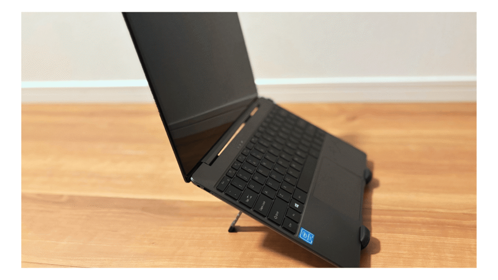 スタンドで画面の高さを上げると、内蔵キーボードとタッチパッドの位置も当然高くなります。これに最初は少し慣れが必要な方もいらっしゃるかもしれません。しかし、多くのユーザーは、正しい姿勢で画面を見られることによる疲労軽減効果の方が大きく、短時間で慣れていくようです。長時間のタイピング作業をされる場合は、スタンドで画面の高さを上げた状態で、外付けのキーボードとマウスを併用されることが、最も快適で健康的な姿勢を実現する方法としておすすめです。