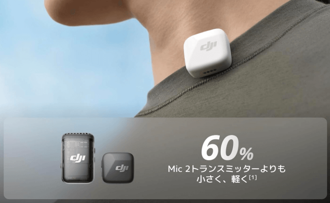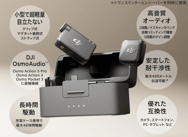 💡 ポイント:DJI Mic Miniは、モビリティと使いやすさを重視したクリエイターに最適なワイヤレスマイクです。特に、10gの軽量設計DJI製品との連携性が大きな魅力となっています。