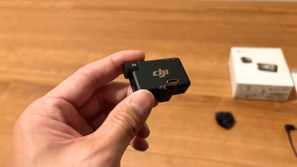 DJI Mic Miniの最大の魅力は、その圧倒的な携帯性にあります。パッケージを開封し、トランスミッター(送信機)を手に取った瞬間に、そのコンセプトが明確に伝わってきます。トランスミッター単体の重量はわずか10g。これは、一般的な単三電池よりも軽く、クリップで衣服に装着しても、その存在をほとんど意識させないレベルです。
