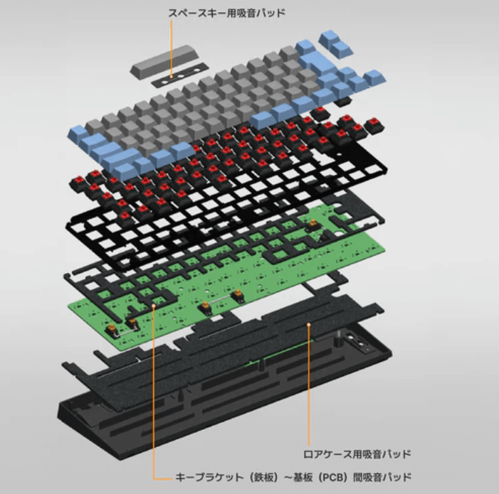 キーボードを裏返し、ネジを外して内部を確認してみると、さらに驚くべきこだわりが発見できます。基板とキーブラケットの間、ロアーケースと基板の間には吸音パッドが内蔵されています。