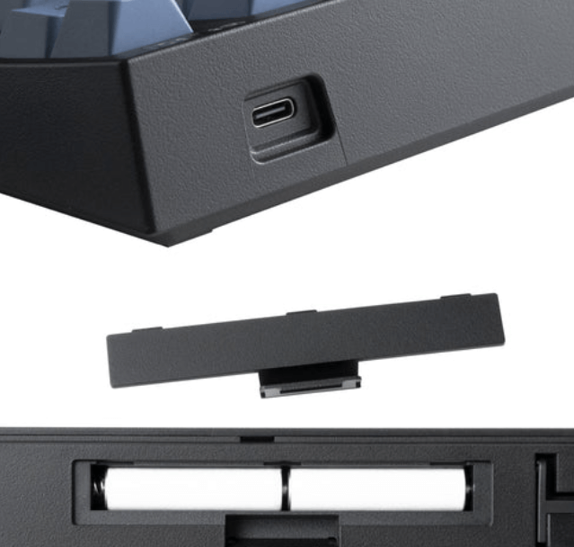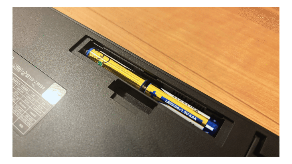 - キーボード背面の電池カバーを開け、単4電池2本を挿入