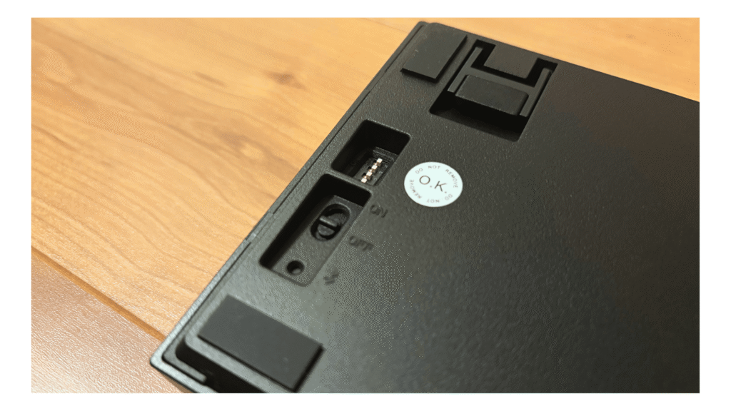 この吸音パッドは、キーの底打ち音やスイッチの反響音を低減する役割を果たします。実際にタイピング音を比較すると、吸音パッドがないキーボードに比べて、高周波数の不快な金属音が抑えられ、落ち着いた打音になっています。