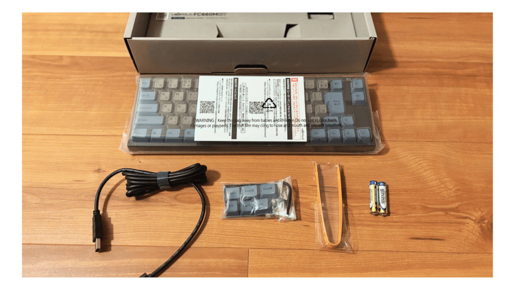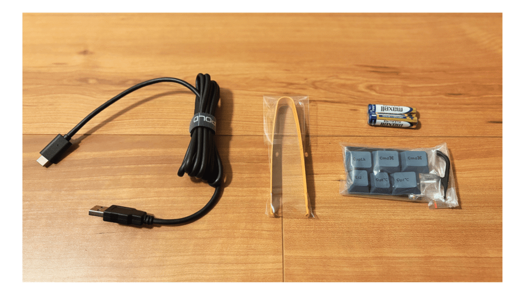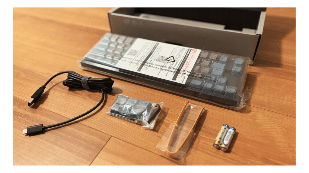 パッケージを開封すると、キーボード本体、USB Type-Cケーブル、キーキャップ引き抜き工具、そして説明書がシンプルに収められていました。