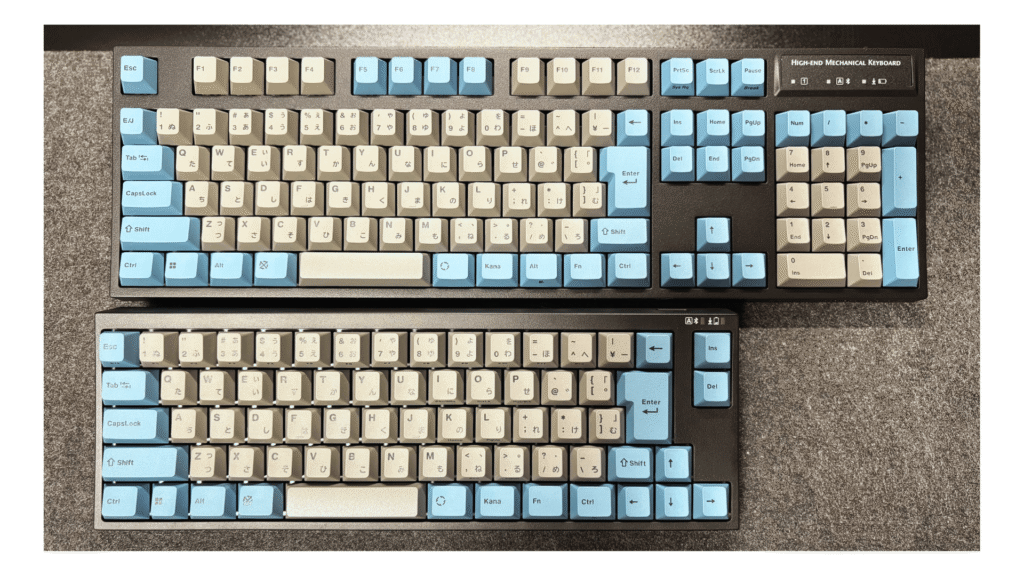 FC660MBTは65%サイズで、横幅約326mmのコンパクト設計。F1-F12キーはFnキーとの組み合わせで使用します。一方、FC900RBTはテンキーレス(80%)サイズで、横幅約387mm。ファンクションキーが独立しており、よりフルサイズに近い配列です。