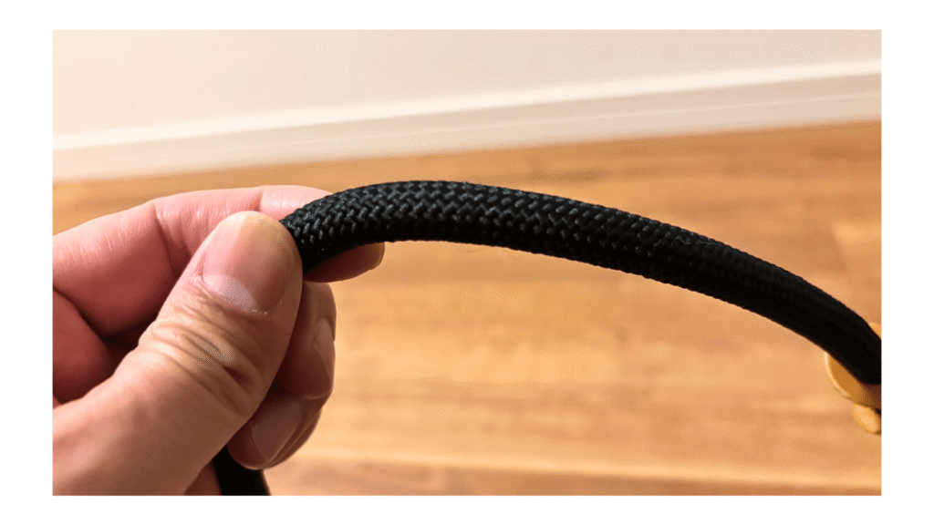 まず手に取って感じるのは、その「ずっしりとした手応え」と「ロープらしい質感」です。一般的なカメラストラップにありがちなペラッとした布地とは一線を画します。素材は150Dナイロン製のクライミングロープ。登山やクライミングの世界では、命綱として信頼されているこの素材を、まさかカメラストラップで目にするとは思いませんでした。編み目は非常に密で、一つ一つの繊維がしっかりと絡み合っているのが視覚的にも触覚的にもわかります。
