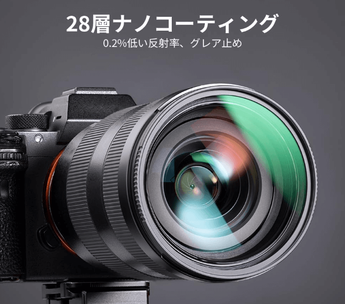 このフィルターの最大の売りは、その光学技術です。スペック上は「28層ナノコーティング」とありますが、これは実際にどのような効果をもたらすのでしょうか?見た目と簡単なテストで検証してみました。