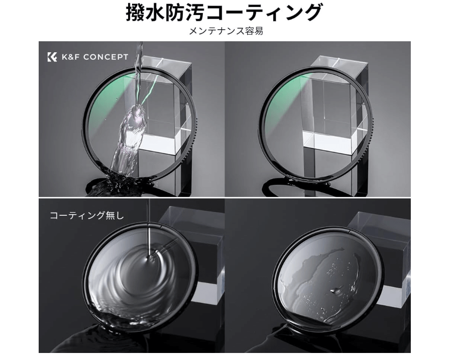 - 水滴が玉になり、拭き取りやすい:雨や霧の中での撮影時、フィルター表面に付いた水滴が広がらず、レンズクロスで簡単に拭き取れます。