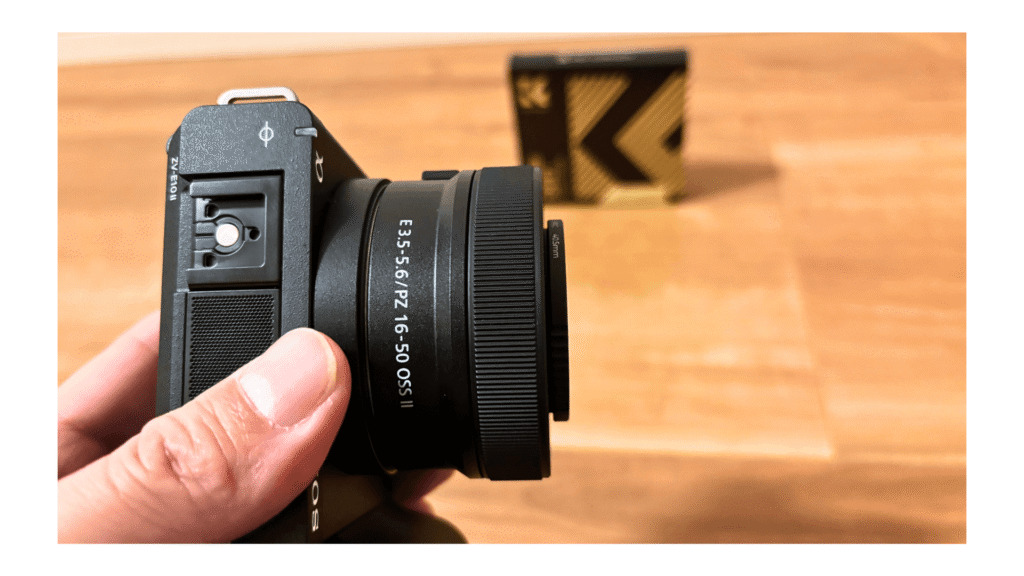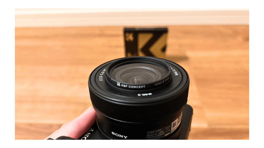 いよいよ、所有する40.5mm口径のレンズに取り付けてみます。フィルターの枠は航空グレードのアルミニウム合金を使用した薄型設計で、その厚みはわずか3.3mm。この薄さは、広角レンズを使用した際に画面の四隅が暗くなる「ケラレ」を防止するための重要な設計です。