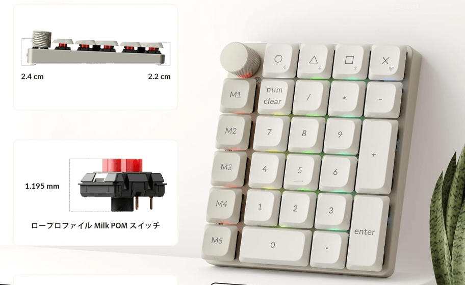 ロープロファイルメカニカル | 3モード | ロープロファイル、回転ノブ、吸音フォーム | QMK/VIA | 〇 フォーム | 中 |