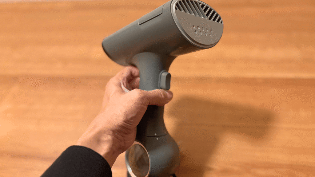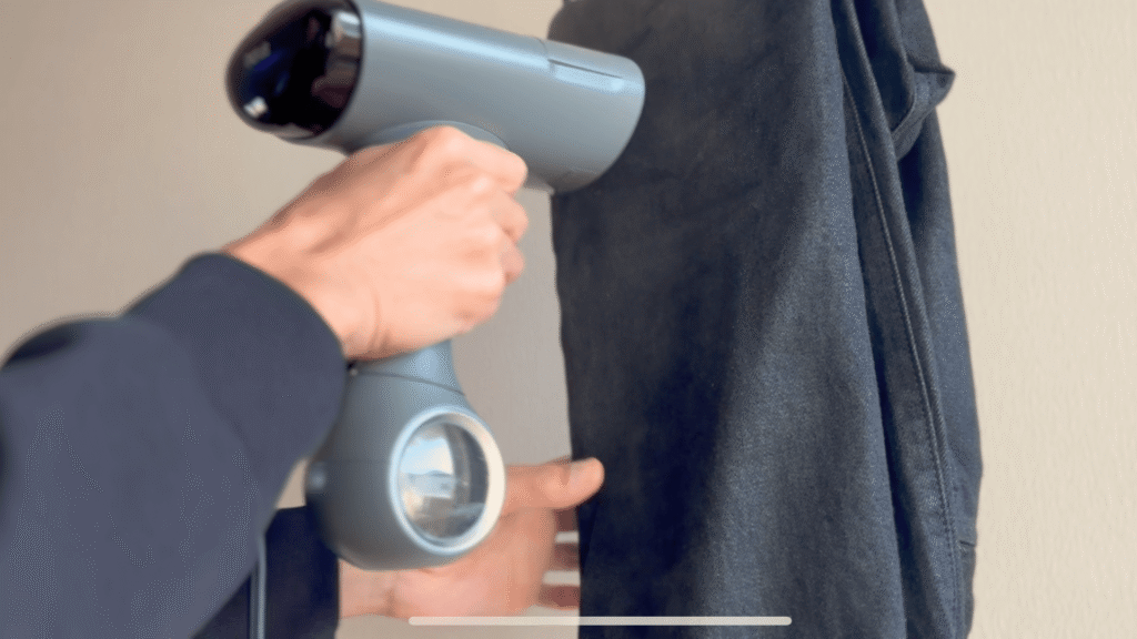 本体重量が約959g(水なし)というのは、一般的な軽量スチーマーと比較すると重い部類に入ります。しかし、Morus V6 Plusは真空吸着機能により、衣類がスチーマーに密着するため、もう一方の手で衣類を引っ張る必要がありません。
