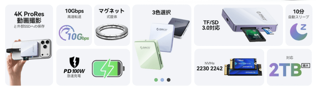 この ORICO D10-2230 M.2 NVMe SSD を、お客様がお持ちの「ORICO 5 in 1 磁気吸着式カードリーダー & M.2 ハードディスクケース」と組み合わせることで、以下のような利用が考えられます。