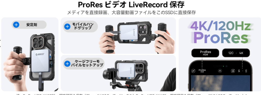 実際にiPhone 16 Proに本ケースを装着し、M.2 NVMe SSDを組み込み、4K/60fps ProRes録画を試みました。マグネット吸着でジンバル使用時などの取り回しが快適。