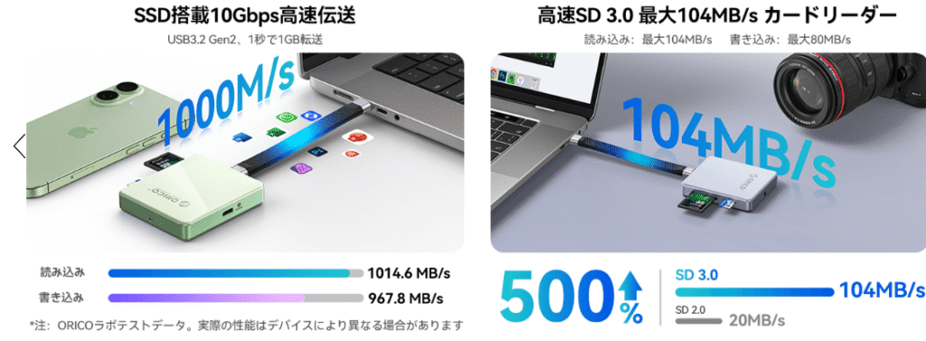 SSDの高速転送とカードリーダーの高速読み取りが一体化していることで、データ移動のボトルネックが解消されます。