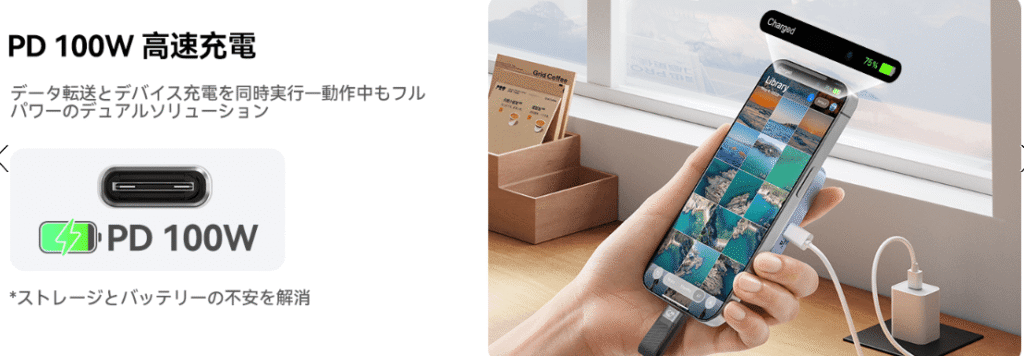 もう一つの重要な機能が、PD(Power Delivery)100W高速充電ポートの搭載です。このポートは、データ転送とは独立して、ホストデバイスへの給電を可能にします。