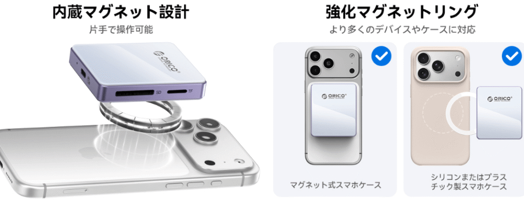 本製品には、デバイスの背面に貼り付けるためのマグネットアダプターが同梱されています。このアダプターをスマートフォンやケースの背面に貼り付けることで、強力なマグネットによる吸着が可能になります。ただし、マグネットアダプターの粘着力や、貼り付けるデバイスの背面素材によっては、安定性が異なる場合があります。特に、ProRes録画など接続の安定性が求められる用途では、しっかりと固定されているか確認してください。