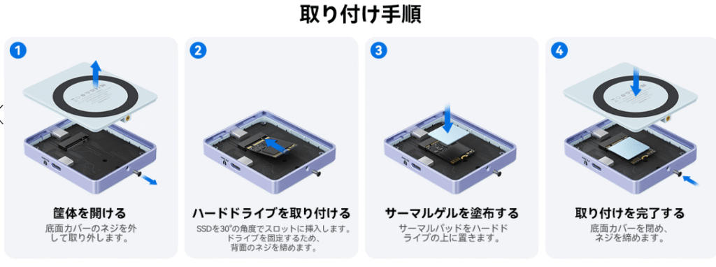 取り付け手順は、ケースのカバーを開け、M.2 NVMe SSDをスロットに差し込み、ネジで固定するだけです。