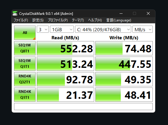 わたしの自宅のPCはUSB 3.2 Gen2対応ポートではないので以下の数字となってしまいました…残念ですが、早いことは間違いなし!