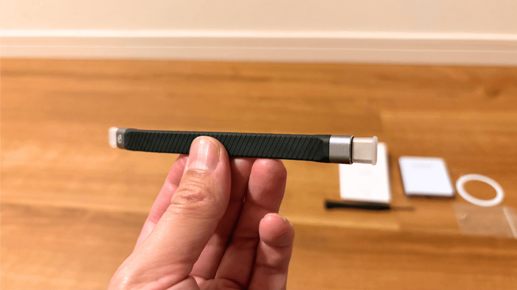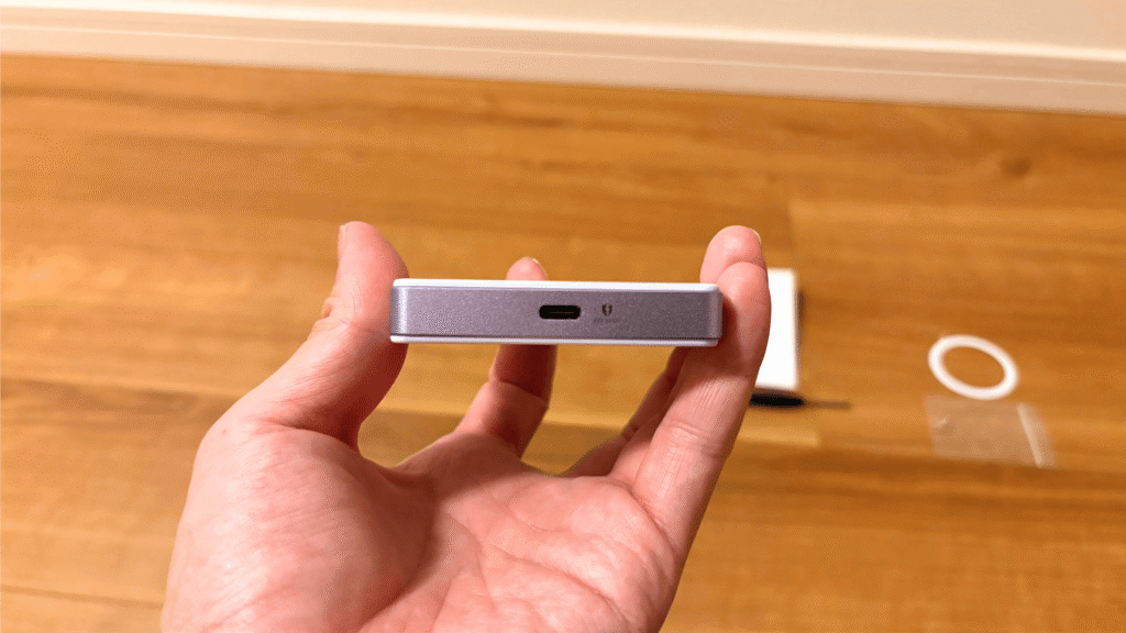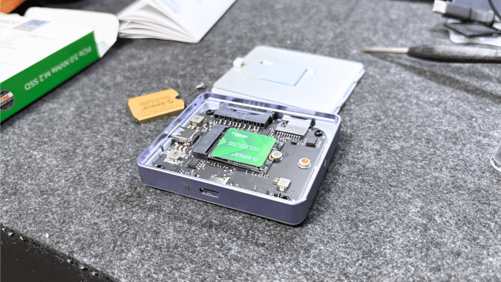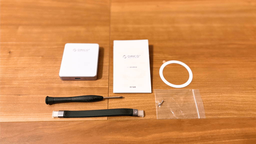 - 付属のドライバーでカバーを開け、M.2 NVMe SSDをスロットに差し込み、ネジで固定します。重要なのは、SSDのチップ部分に同梱の放熱シートを貼り付け、熱をアルミニウム筐体へ効率よく逃がすことです。工具も全て揃っており、放熱シートは高速転送時の熱対策として安定動作に直結します。