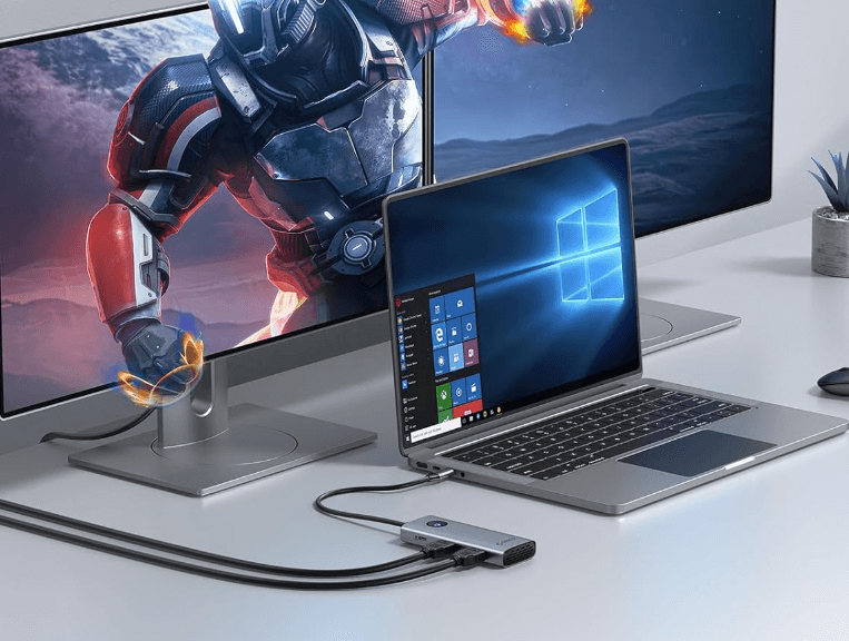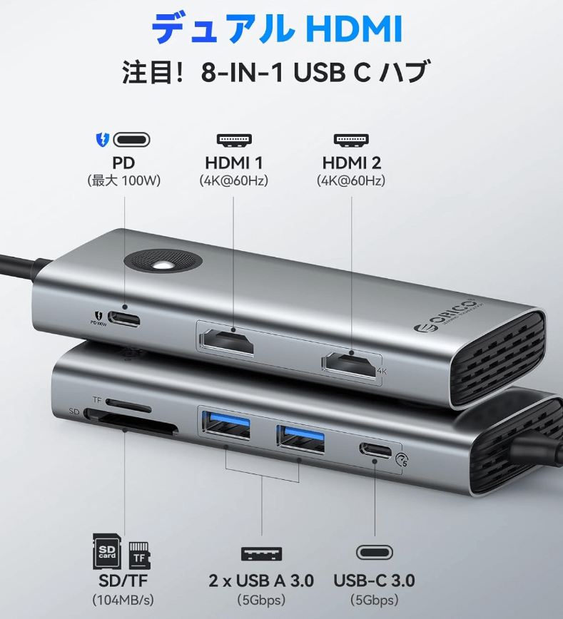 最大の特長の一つが、2つのHDMIポートによるデュアル4K出力です。最近のノートPC、特にUSB-Cポートが1つか2つしかない機種では、これ自体が夢のような機能です。