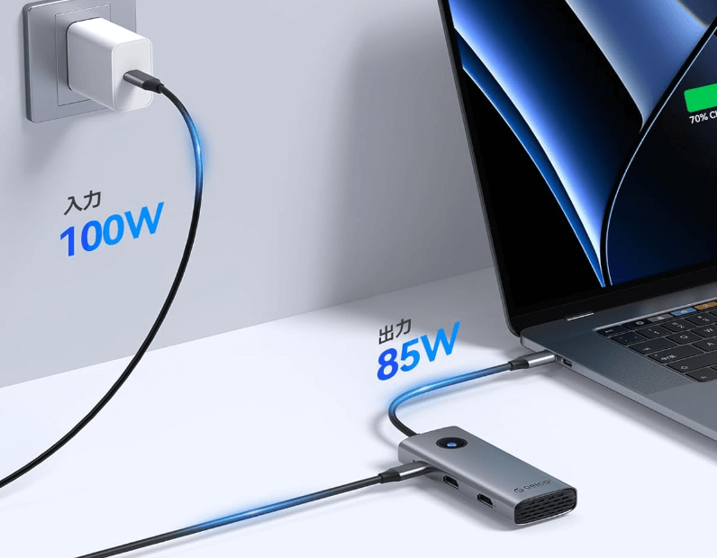 モバイルワークの悩みの種は、バッテリー切れです。ORICOドッキングステーションは、USB-C PD(Power Delivery)ポートを備え、最大100Wの給電が可能です。これは最新の高性能ノートパソコンを急速充電できる十分な電力です。