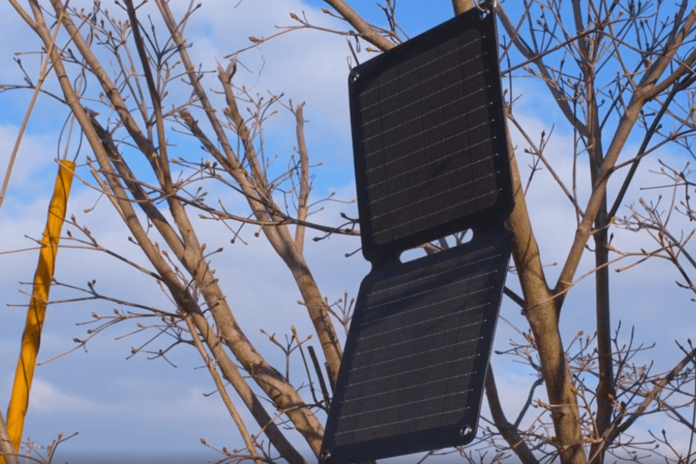この製品の特長の一つが、テントなどに吊り下げて使えるホール付きであることです。公園では木の枝にS字のフックを使って吊るしてみました(カラビナは別売りです)。地面に置くよりも風通しが良く、パネルの温度上昇を抑えられる可能性があります。