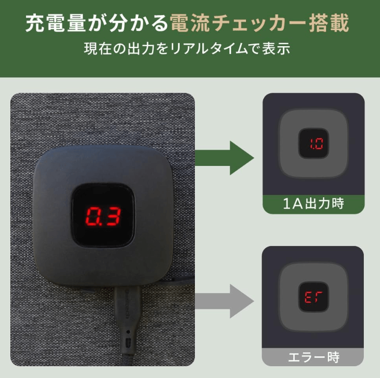この製品の電流チェッカーは、実際にスマホなどに流れている電流を数値で表示してくれるため、「今、本当に発電できているのか?」がひと目でわかります。数値が0のままだれば、パネルの向きや角度、設置場所に問題があるとすぐに気づけます。