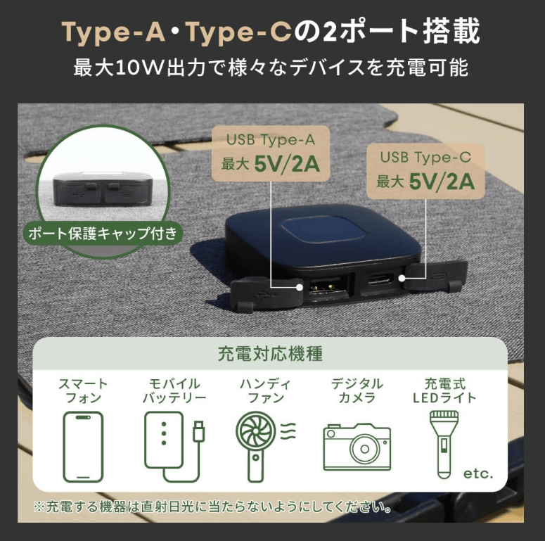 USB Type-AポートまたはUSB Type-Cポートを持つ機器であれば、基本的に充電可能です。具体的には、タブレット、モバイルバッテリー、ポータブルスピーカー、ゲーム機、デジタルカメラなどが挙げられます。ただし、ワイヤレスイヤホンのような微弱電流(0.1A以下)で充電する機器は、ソーラーパネルの出力が安定しないため充電できない場合があります。また、機器によって必要な電流値が異なるため、全ての機器での動作を保証するものではありません。接続する際は、対応する充電ケーブルを必ずご用意ください。