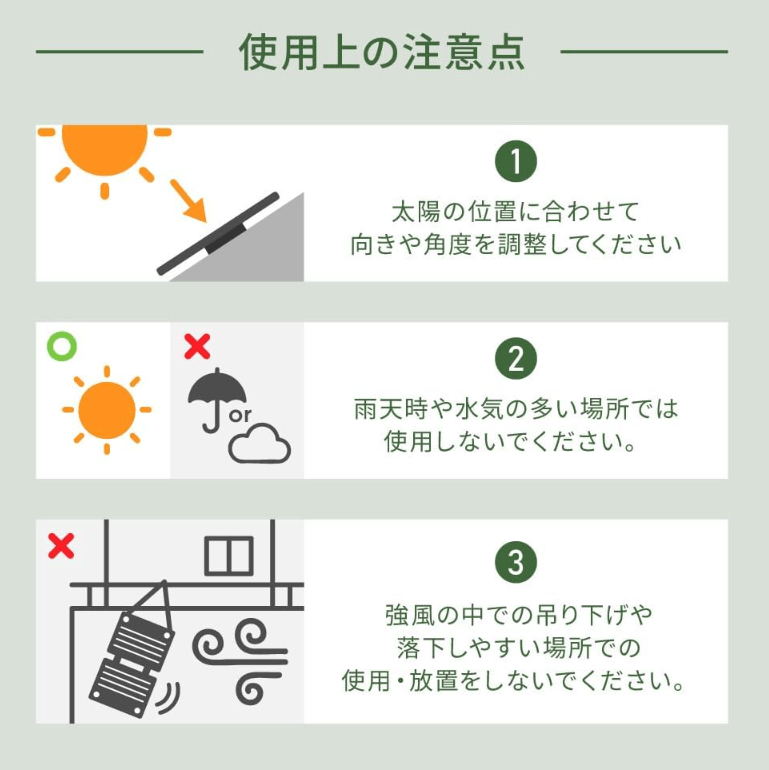 また、ソーラーパネルの表面が汚れると発電効率は低下します 。こまめに柔らかい布で優しく拭くようにしましょう。特に鳥のフンなどが付着した場合は、放置せずに早めに掃除することをおすすめします。保証期間は6ヶ月間ありますが、丁寧に扱うことで、その期間を過ぎても長く愛用できるはずです。
