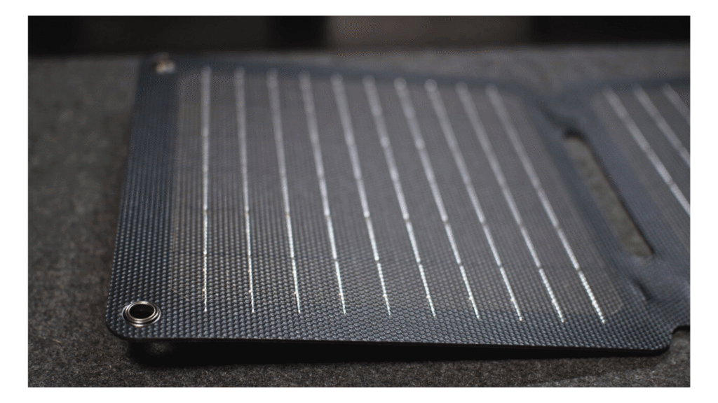 そこで、日中にこのパネルでバッテリーを充電しておき、夜間はそのバッテリーからスマホを充電する方法が効率的です。準固体電池は発火のリスクを低減。高温や衝撃に強いのが特長。防災リュックに入れておくにも安心です。