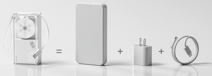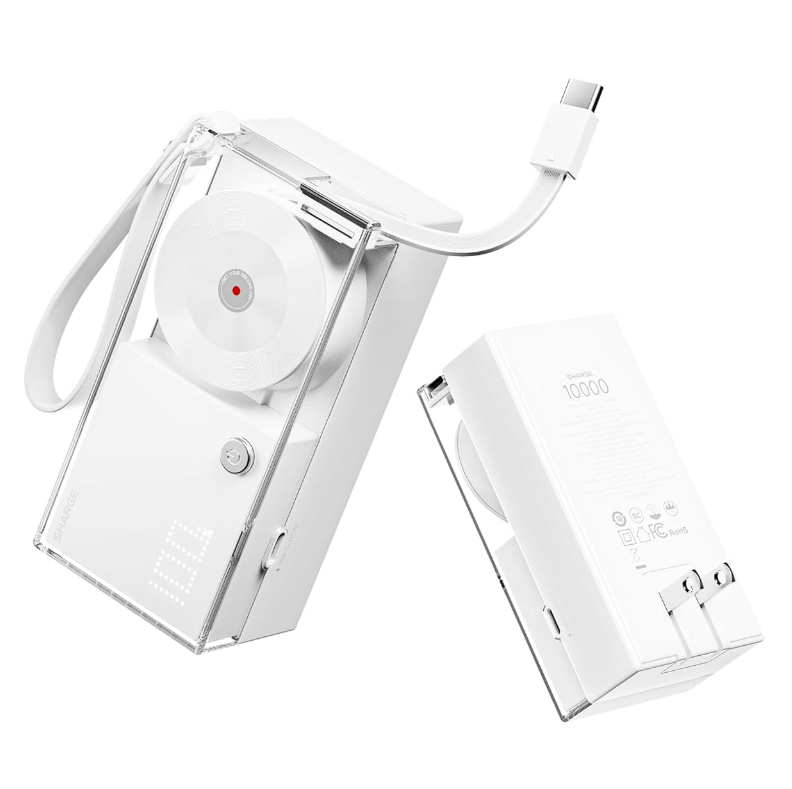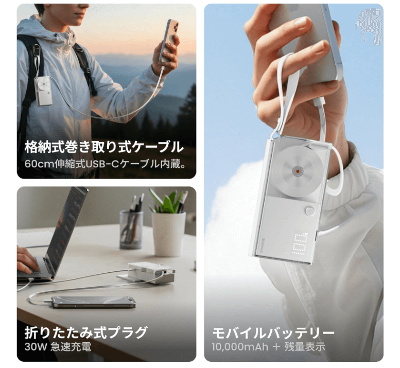 市場には、コンセント一体型のモバイルバッテリーや、GaN技術を採用した充電器は多数存在しますが、SHARGE 3-in-1のように「GaN充電器」「10,000mAhモバイルバッテリー」「巻き取り式ケーブル」「透明デザイン」「ドットマトリックス表示」のすべてを兼ね備えた製品は他に類を見ません。