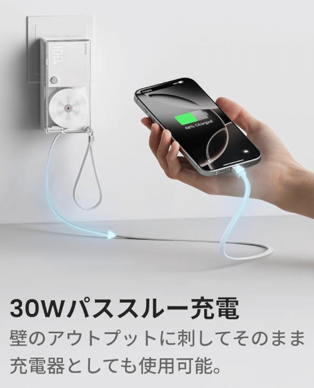 自宅やオフィスでは、本製品は30WのGaN壁充電器として活躍します。コンセントに直接挿し込むことで、内蔵されたモバイルバッテリーを充電しながら、同時に内蔵ケーブルやUSB-Cポートから接続されたデバイスを高速充電できます。