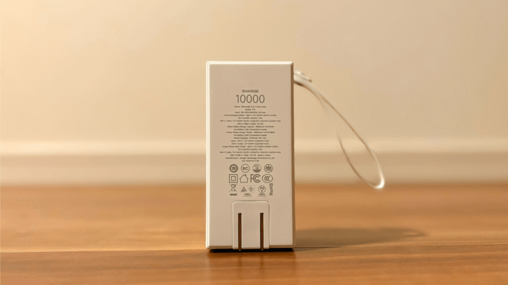 SHARGE 格納式 3-in-1の最大の魅力は、その名の通り、「コンセントの充電器」「10,000mAhモバイルバッテリー」「巻き取り式USB-Cケーブル」という、充電に必要な3つの要素を、わずか約110 x 52 x 40mmのコンパクトな筐体に統合した点にあります。
