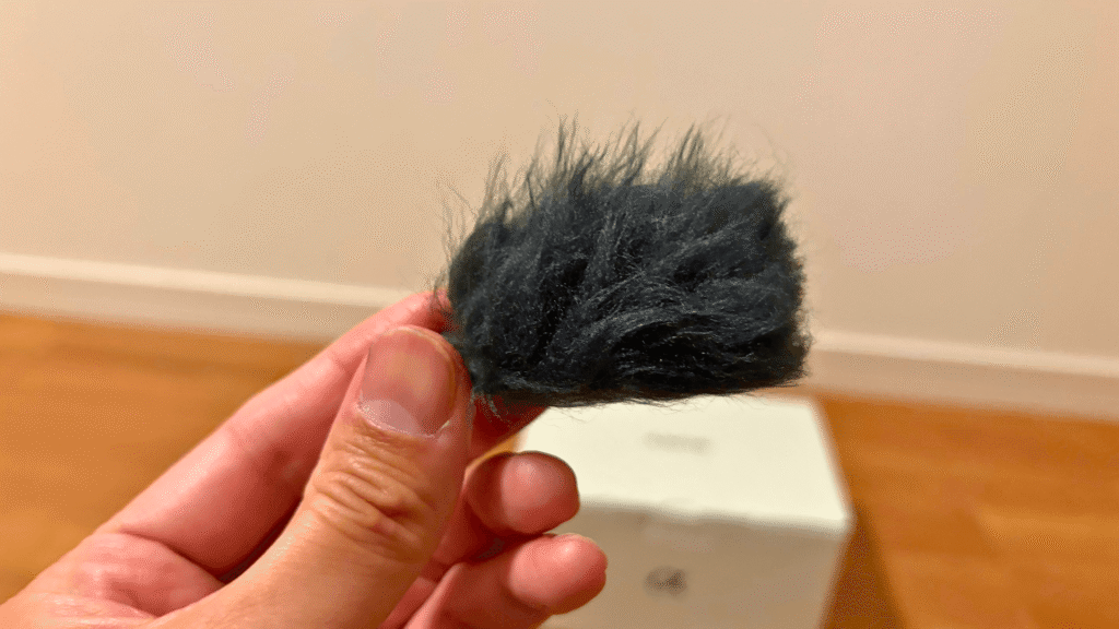 この小さなスポンジの塊は、Vloggerにとって最も価値ある付属品の一つかもしれません。屋外で風が吹く中、これを装着するか否かで、収録音声のクオリティは「使い物にならない」と「プロ並みにクリア」という天地の差が生まれます。物理的に風がマイクユニットに直接当たるのを防ぎ、低周波の風ノイズ(ブルブルという振動音)をほぼ完全にカットします。