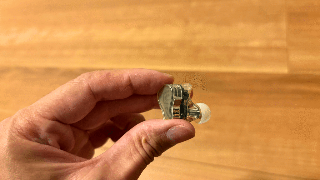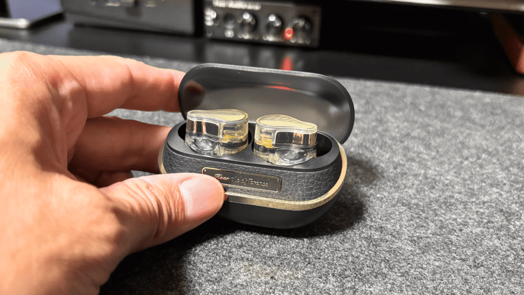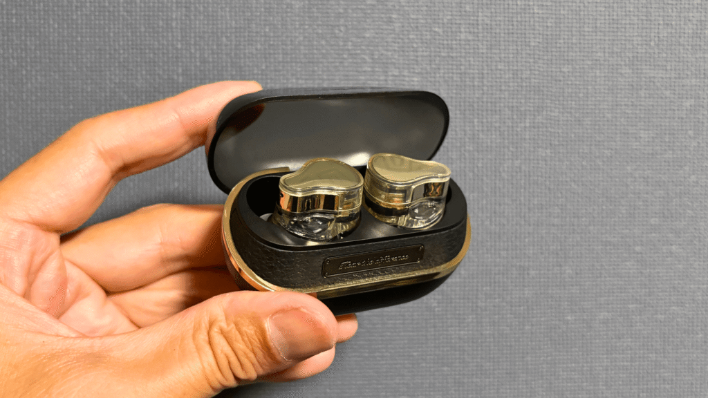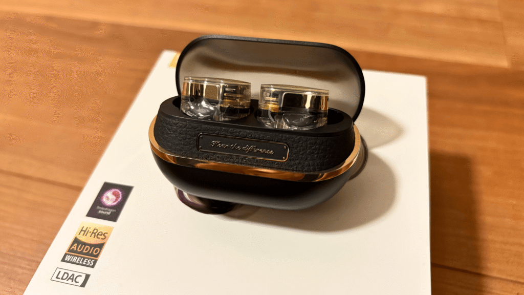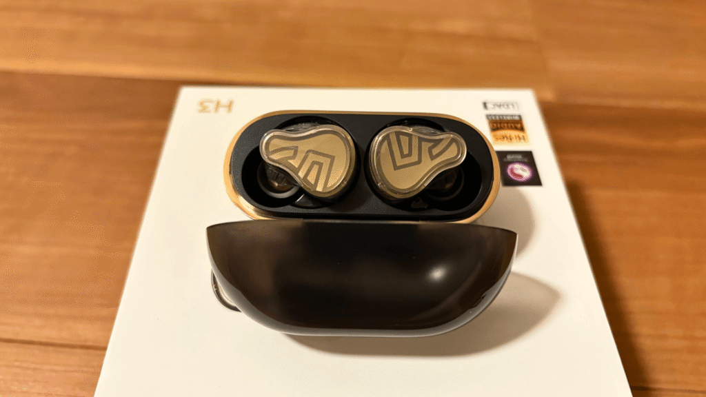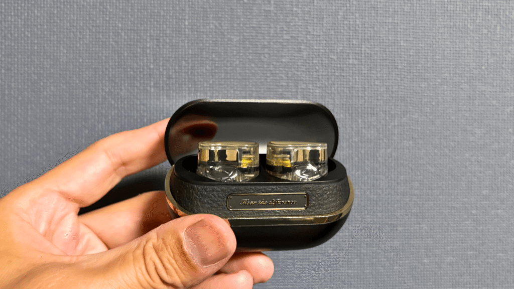 充電ケースは、手に取るとずっしりとした重みがあり、高級感が漂います。レザー調の質感とメタルプレートの組み合わせは、所有欲を満たしてくれるデザインです。ケースを開けると、クリスタル調の透明筐体を持つイヤホン本体が顔を出し、その美しさに思わず見とれてしまいます。開封の瞬間から、H3が特別な製品であることが伝わってきました。
